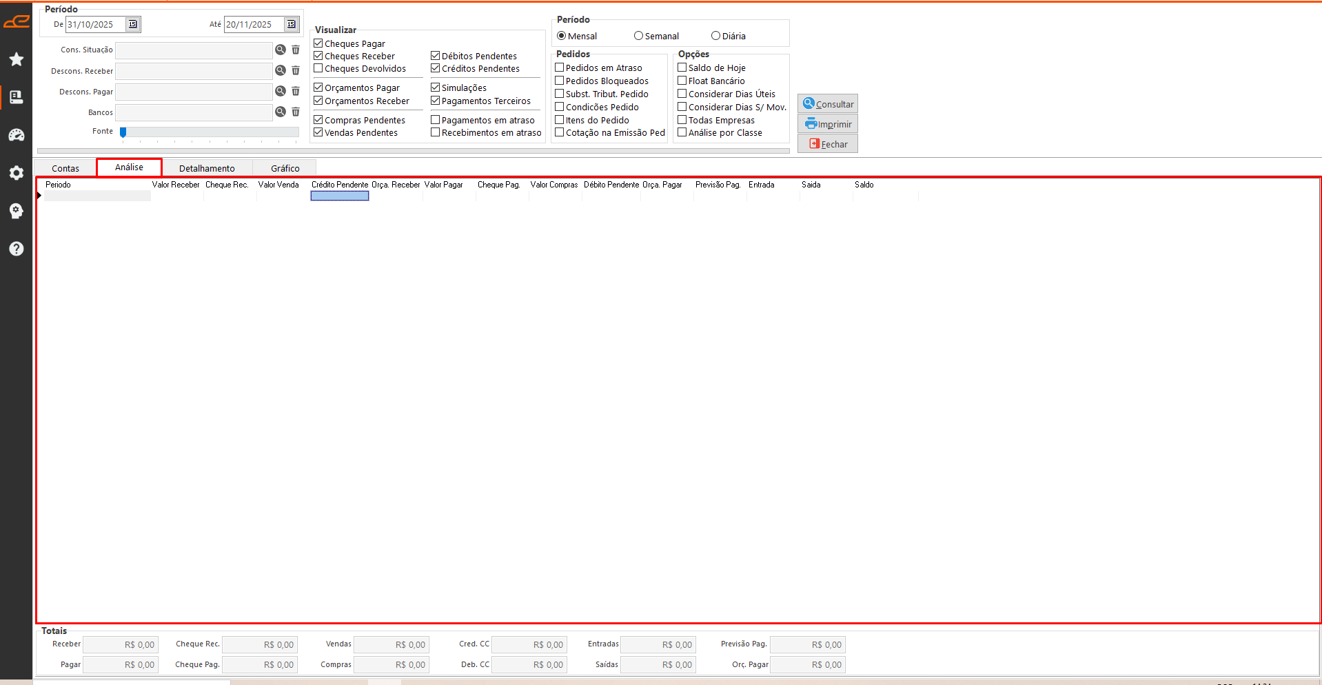 - Análise: Exibe a análise do fluxo de caixa de acordo com a visualização selecionada. Ao clicar duas vezes em um registro, é aberta a tabela de Detalhamento com as duplicatas correspondentes ao registro selecionado.