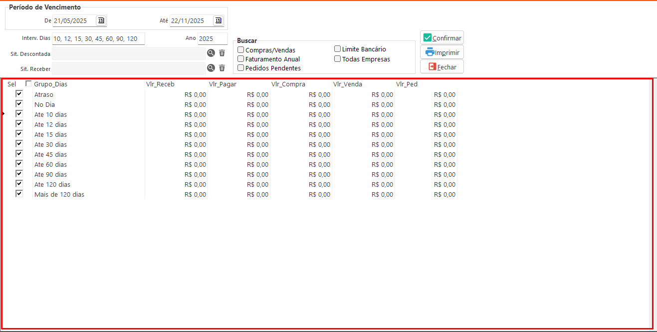- Interv. Dias: Informa os intervalos de dias utilizados para agrupar e exibir os valores dentro do período selecionado.