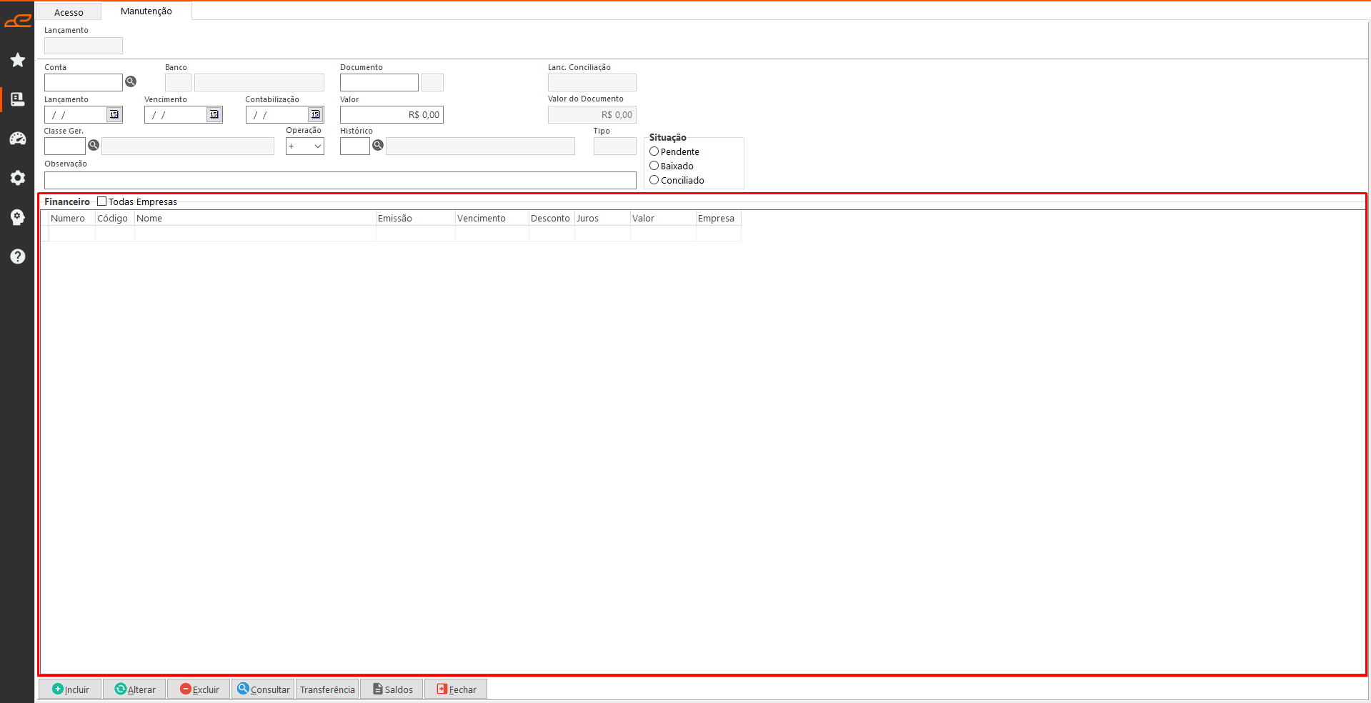 - Todos: Permite consultar lançamentos pendentes, baixados e conciliados.