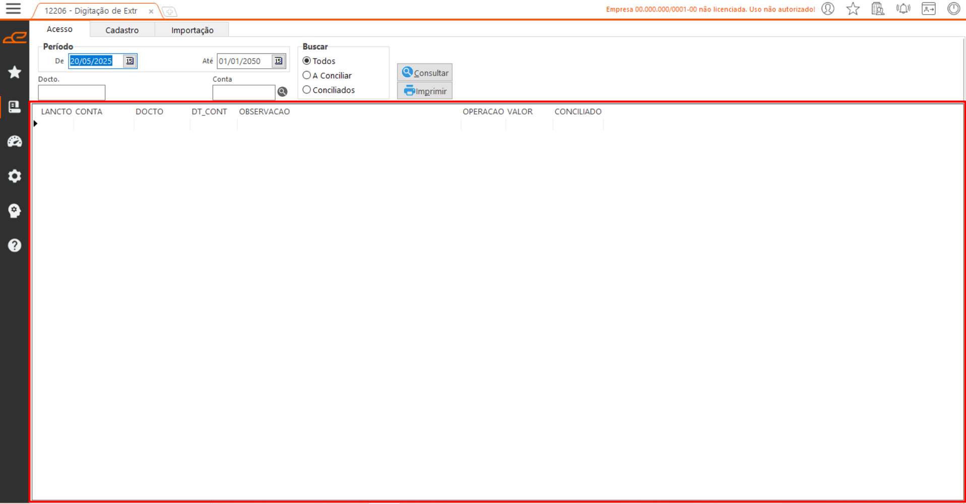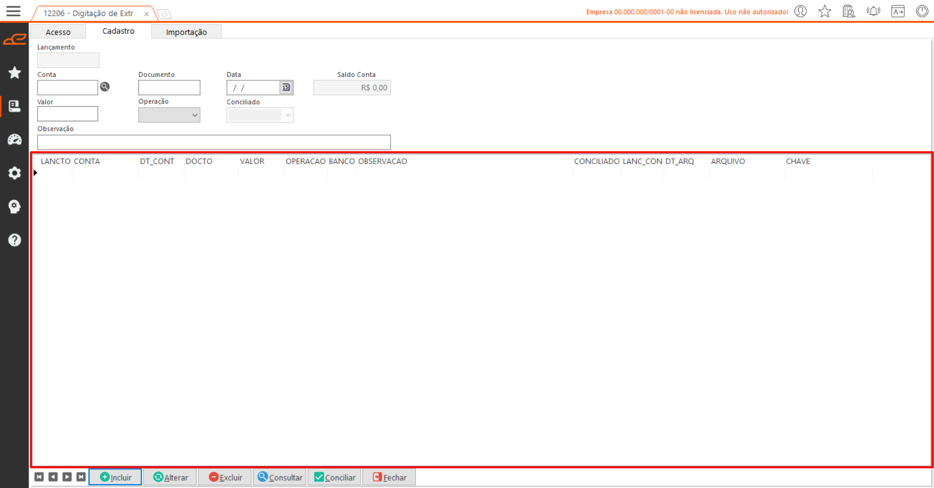 - Alterar: Permite a alteração de um lançamento de extrato bancário.