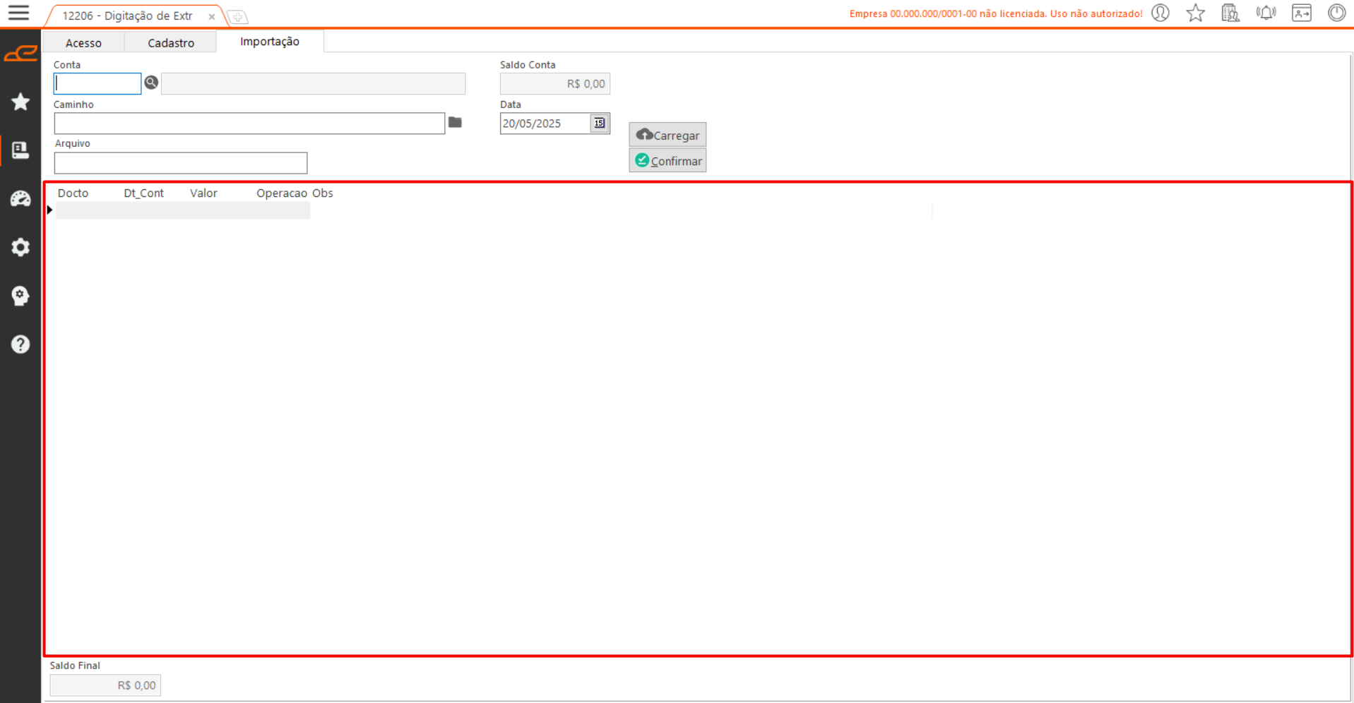 - Carregar: O sistema carrega os extratos bancários na tabela, com base no caminho informado, para que possam ser validados e confirmados antes da importação.