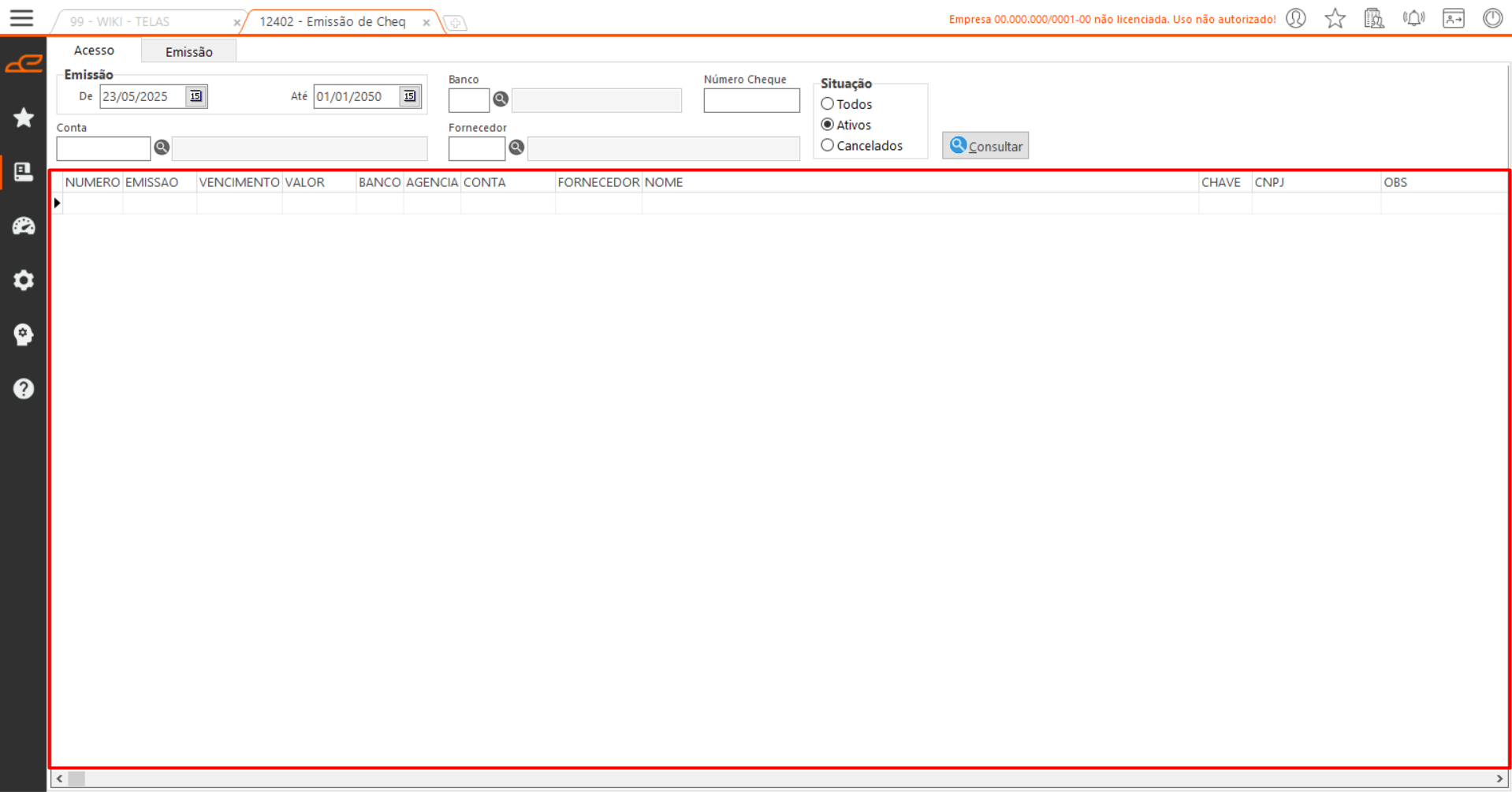 - Emissão: Emissão: Filtro de datas no formato ‘De’ e ‘Até’, referente à data de emissão do cheque.