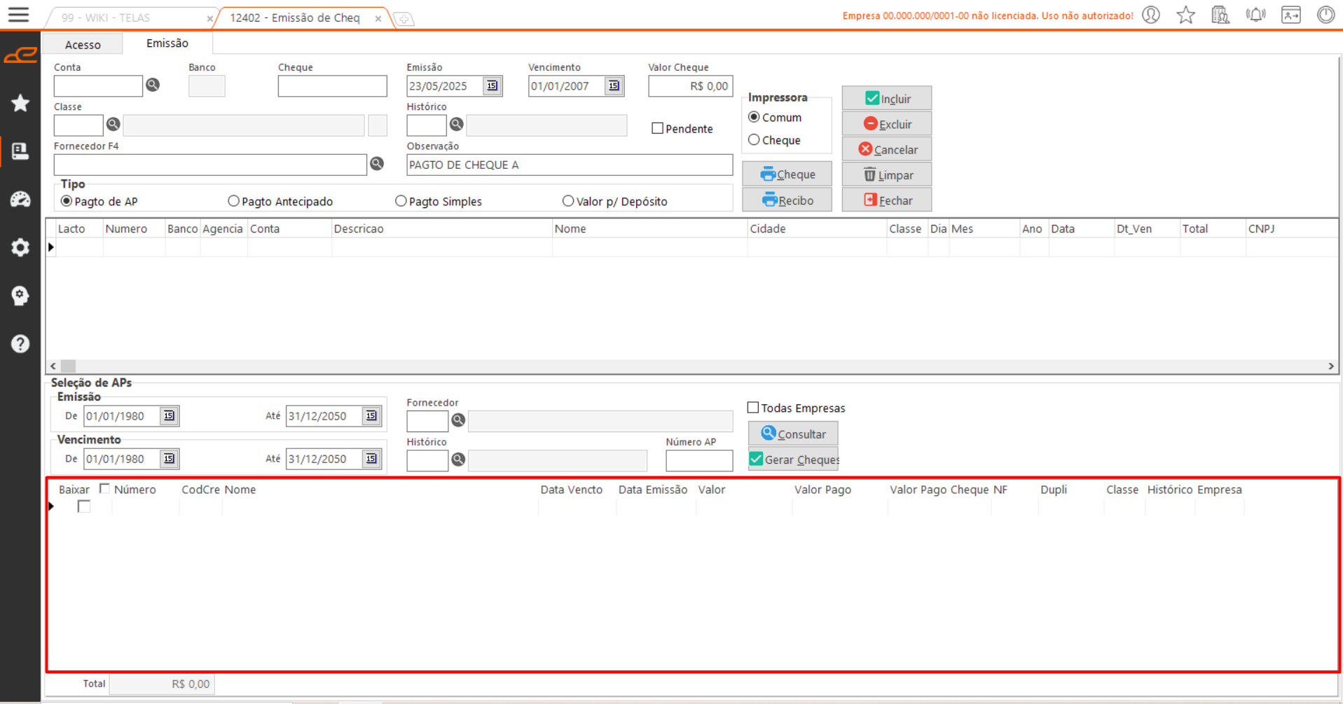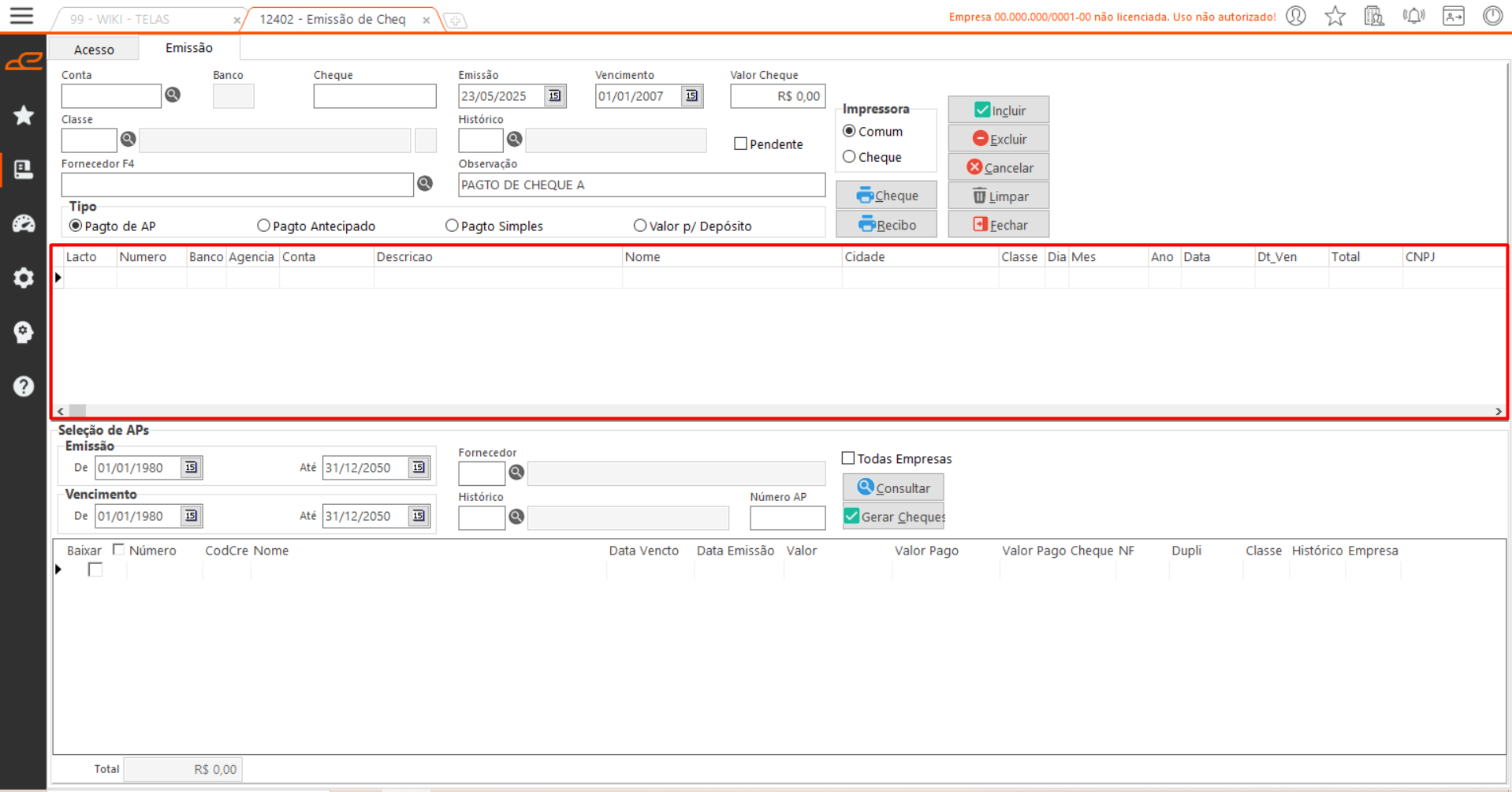 - Gerar Cheque: Permite gerar cheques com base nas APs selecionadas e realiza o lançamento que baixa essas APs.