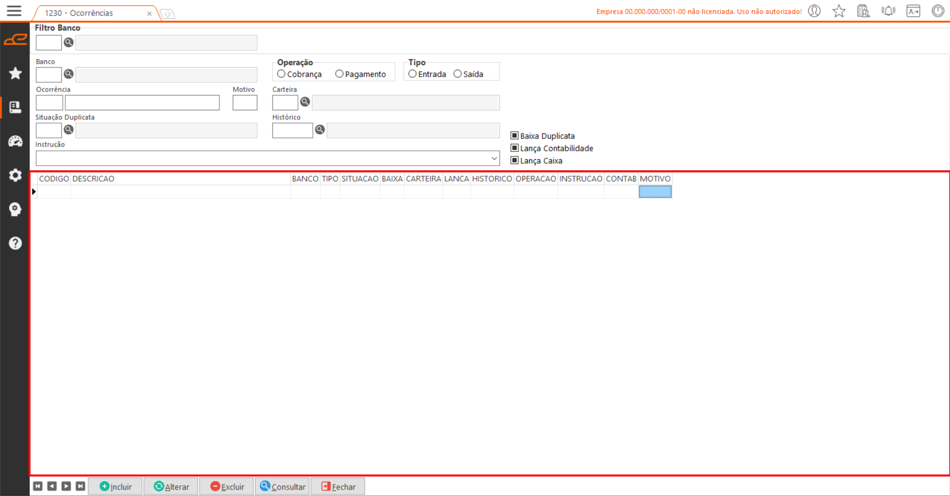 A tela “Ocorrências” Permite cadastrar as ocorrências que serão enviadas aos bancos nos arquivos de remessa e que serão retornadas pelos bancos nos arquivos de retorno.