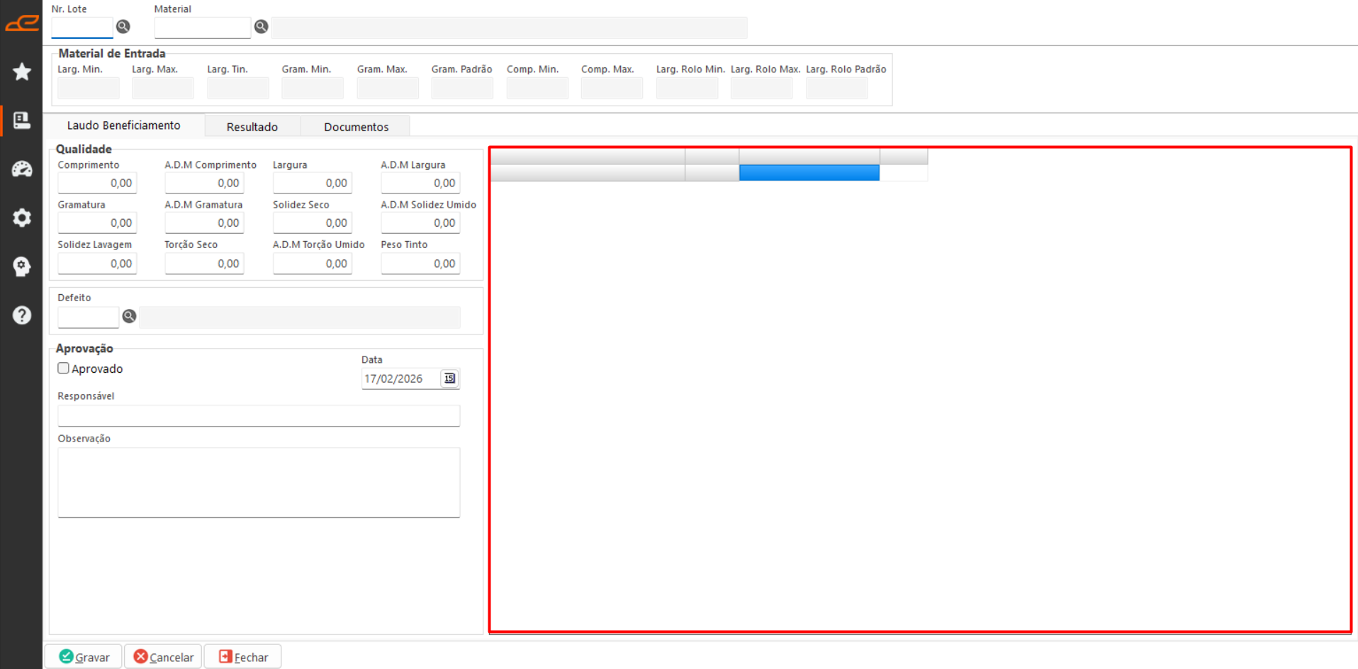 - Responsável: Informar o nome do responsável da aprovação do laudo para controle de Qualidade.