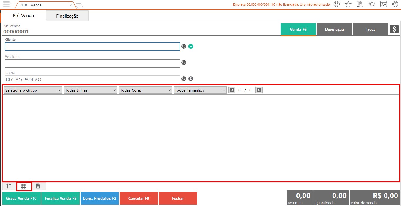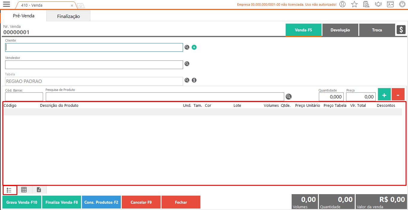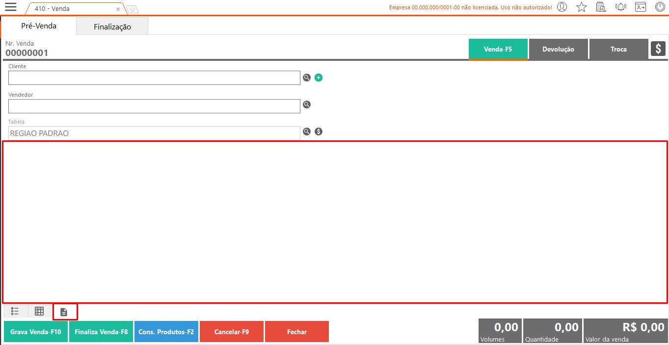 Está aba é habilitada após iniciar uma operação na aba Pré-Venda ou clicando em finalizar na aba Vendas.
