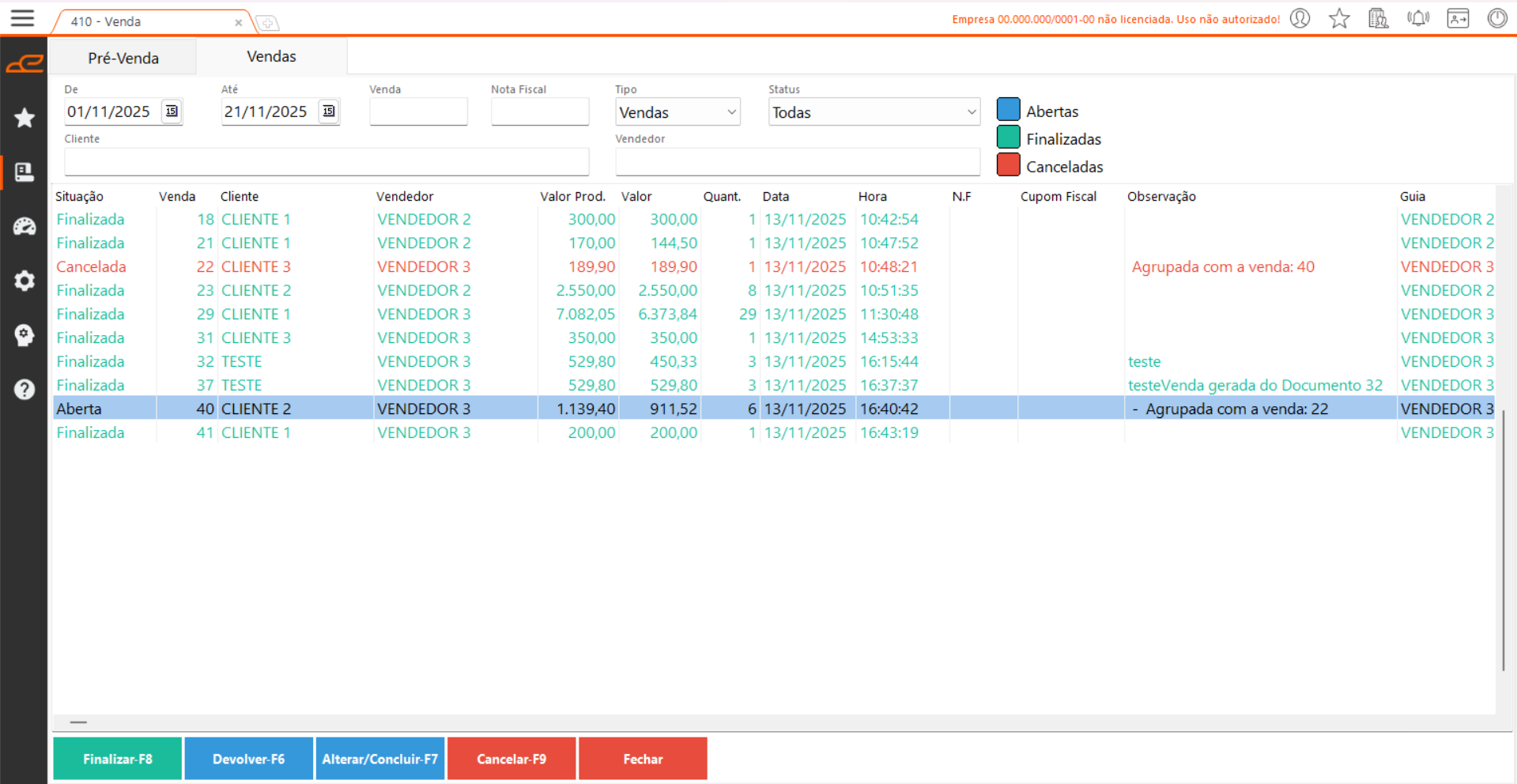 Está aba é utilizada para consulta de vendas, sendo possível executar alterações em vendas já cadastradas.