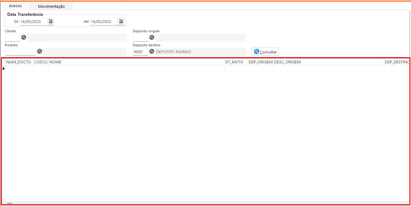 - Transferência: Exibe as informações referentes à movimentação, permitindo consultar ou alterar o registro na aba Movimentação por meio de duplo clique sobre a linha da tabela.