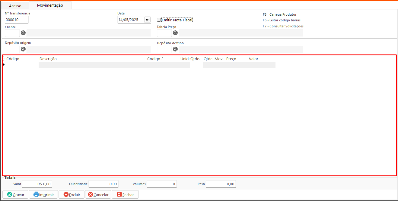 A tela Transferência de Produtos entre Depósitos tem como objetivo permitir o controle e registro das movimentações de itens entre depósitos internos da empresa.