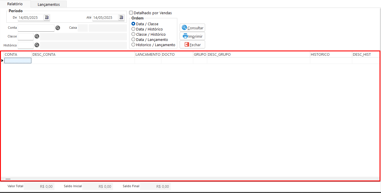 • Saldo Inicial: Informa o valor acumulado das movimentações da conta selecionada em períodos anteriores ao consultado.