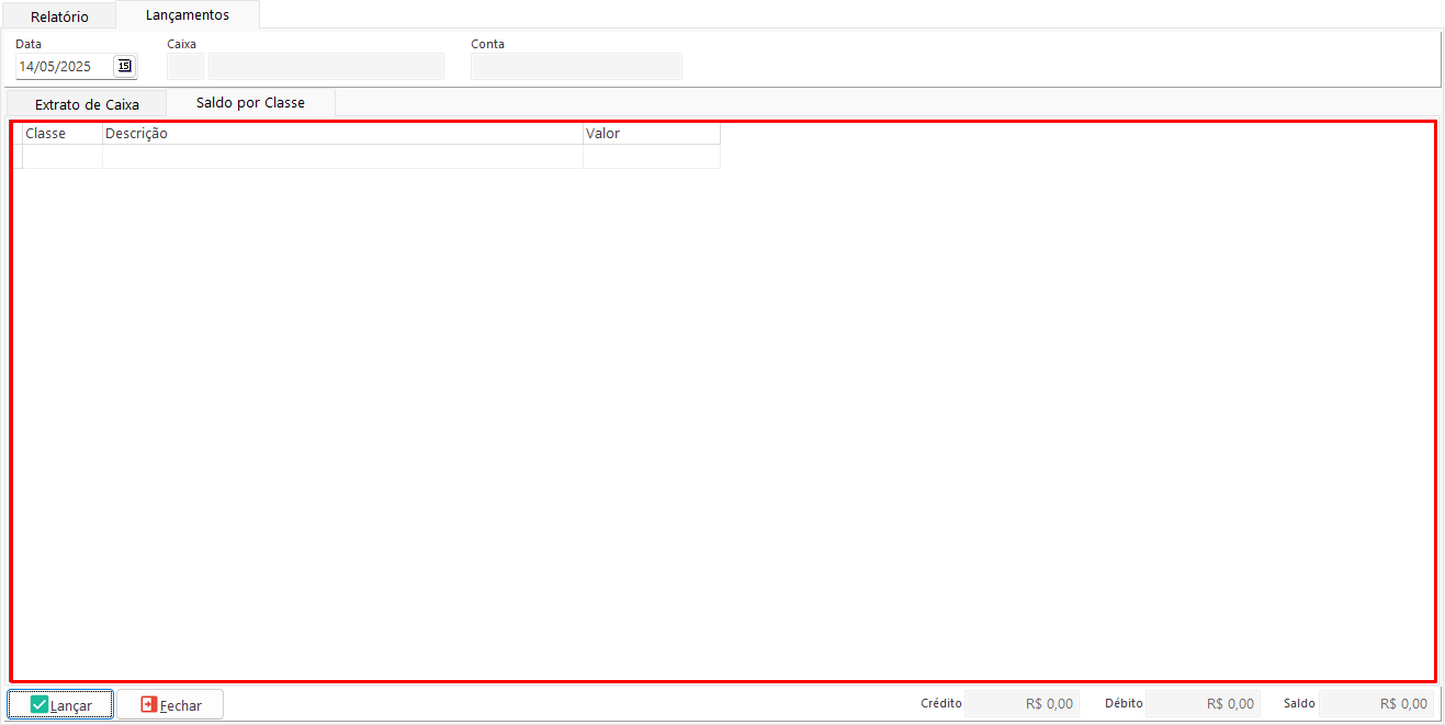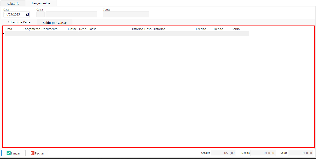 Nesta aba é possível consultar o extrato do caixa em uma data específica, visualizar os saldos por classe e realizar novos lançamentos de movimentação de caixa.