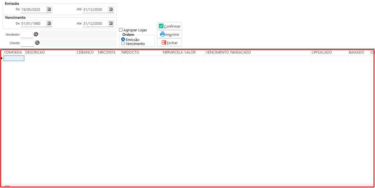 - Confirmar: Executa a consulta conforme os filtros informados.