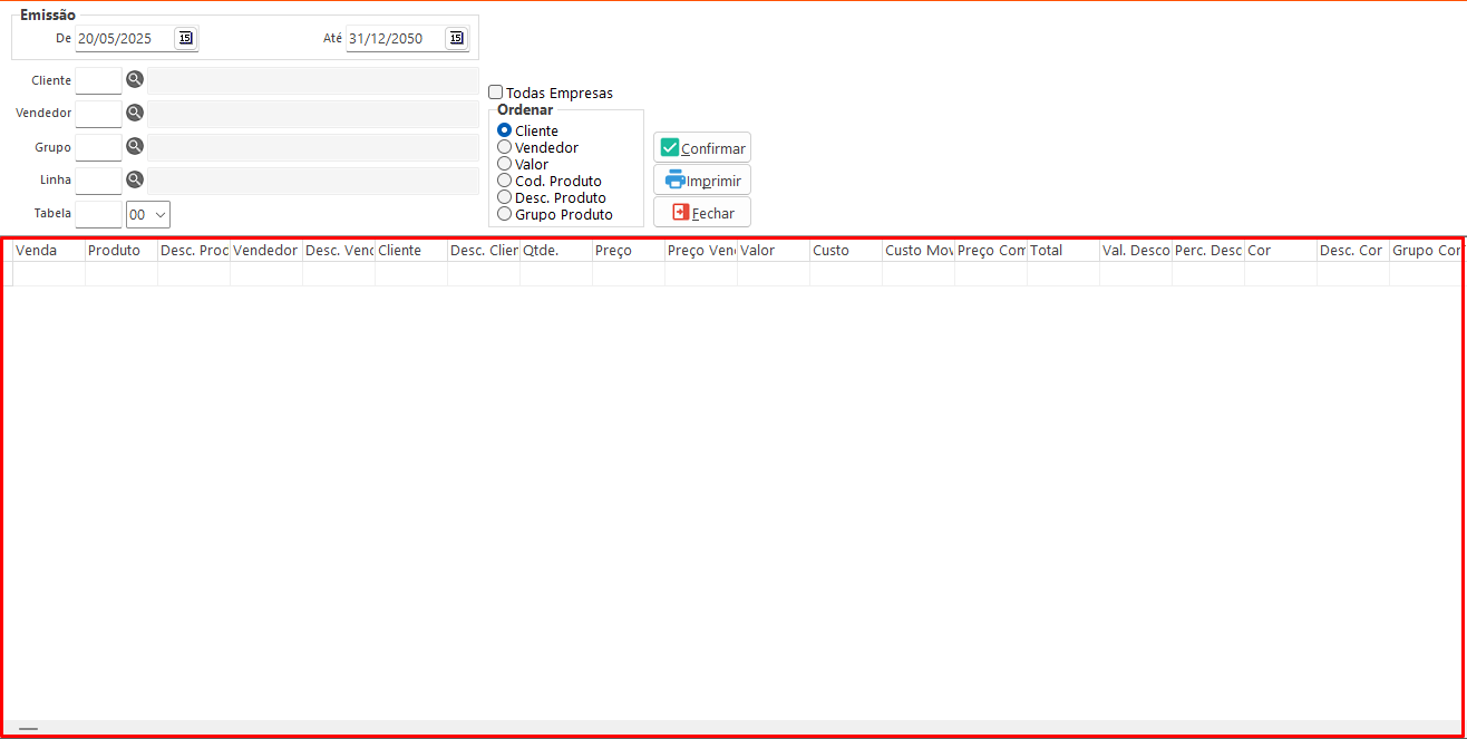 • Emissão: Permite filtrar as vendas pela data de emissão.